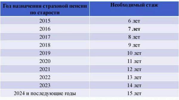 Постепенное увеличение закончится в 2024 году, когда минимальный стаж достигнет отметки 15 лет.