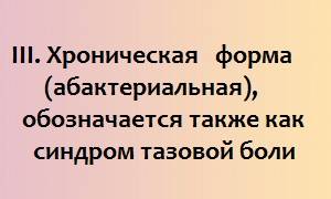 ![]() | Основной клинический симптом – наличие болевого синдрома в течение и более трех месяцев. При этом в секрете, моче и эякуляте патогенные микробы не обнаруживаются. |
