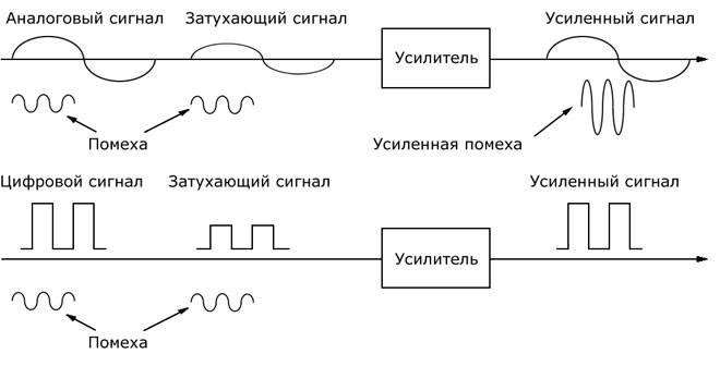 - Устойчивость к помехам: цифровой сигнал лучше переносит помехи и шумы, так как значения сигнала ограничены и можно использовать специальные алгоритмы для корректировки ошибок.
