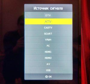 Чтобы определить тип сигнала, нужно заглянуть в меню телевизора. Если в разделе «Источник» установлено ATV, идет просмотр аналогового видеоконтента.