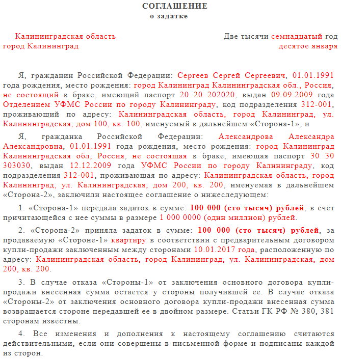 Документ о задатке не имеет строго установленной формы. По ГК РФ, основным требованием, выдвигаемым к нему, является составление в письменном виде. Этот документ считается предварительным и должен содержать определённые разделы: