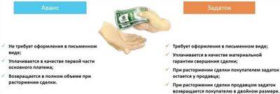 | Назначение платежа и его основная функция | Является финансовым обеспечением, гарантирующим участие сторон в предстоящей сделке. При отказе он нее наступают материальные последствия. | Передача и получение аванса не гарантирует, что стороны исполнят свои обязательства, поскольку аванс является лишь предоплатой по предстоящей сделке |