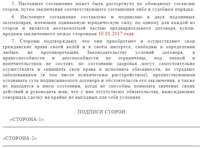 Стороны указывают в нем, что продавец возвращает покупателю деньги, после чего сделка расторгается без претензий друг к другу.