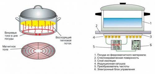 Индукционные плиты не греются сами по себе. В качестве источника магнитного поля выступает индуктор, запитанный от высокочастотного источника питания. Они накрыты стеклянной термостойкой панелью. Пищу греет дно посуды, когда находится под воздействием этого поля. Если вы снимите кастрюлю с плиты — то плита отключится, а когда поставите обратно — включится. Чем толще дно посуды — тем лучше происходит нагрев.