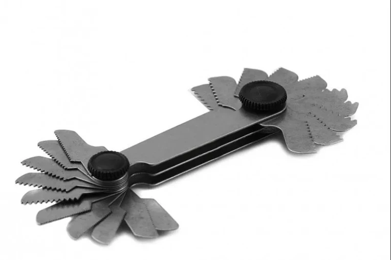 Определить требуемые размеры можно при помощи резьбомера, представляющего собой пластину с зазубринами, форма и другие характеристики которых точно соответствуют параметрам резьбы с определенным шагом. Такая пластина, выступающая в роли шаблона, просто прикладывается к проверяемой резьбе своей зазубренной частью. О том, что резьба на проверяемом элементе соответствует требуемым параметрам, будет свидетельствовать плотное прилегание к ее профилю зазубренной части пластины.
