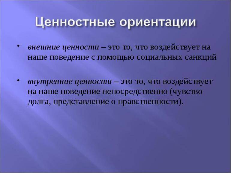 Еще один критерий делит ценности на внешние и внутренние. Эта градация основана на том, насколько люди считают их своими целями