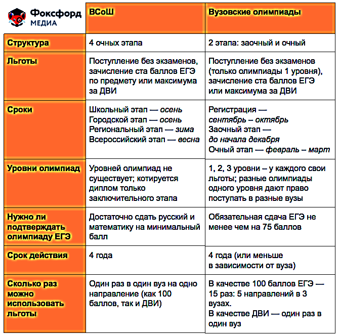 Льготы — Вузовские олимпиады различаются по уровням, а вузы сами определяют «цену» дипломов и баллы ЕГЭ для подтверждения диплома. Одна олимпиада по разным предметам может относится к разным уровням. Например, «Высшая проба» по английскому — первый уровень, а по информатике — второй. Узнайте точную информацию на на сайте Российского совета олимпиад школьников,