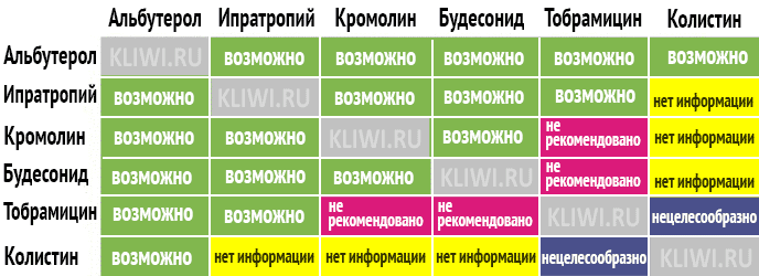 Что касается готовой одновременной комбинации, где оба лекарства смешиваются и доставляются в одной ингаляции, то она признана возможной. В таблице приведены результаты оценки исследования (5) совместимости лекарственных растворов в небулайзерах, где показано, что данные ингаляционные растворы физико-химически совместимы.