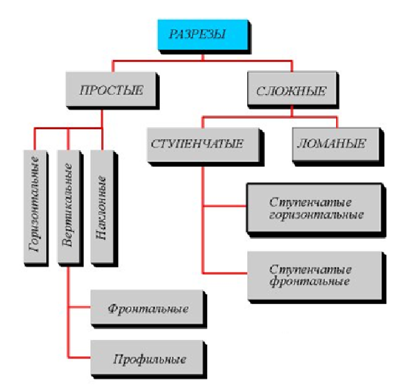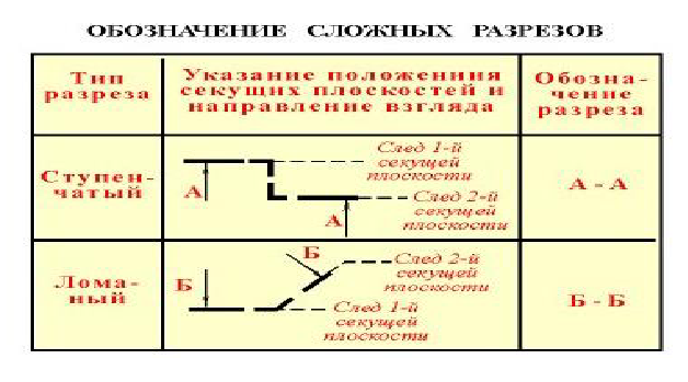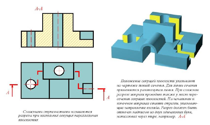 - Помимо самых простых (одноплоскостных) разрезов существуют разрезы сложные: один такой разрез может объединять в себе общее изображение, созданное сразу несколькими секущими плоскостями, сгруппированными определённым образом (так называемые ступенчатые/ломаные разрезы).