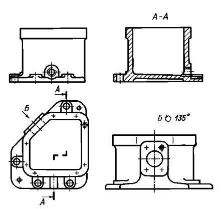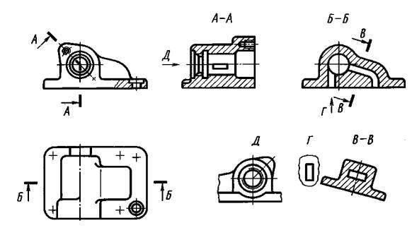 Несколько одинаковых дополнительных видов, относящихся к одному предмету, обозначают одной буквой и вычерчивают один вид. Если при этом связанные с дополнительным видом части предмета расположены под различными углами, то к обозначению вида условное графическое обозначение