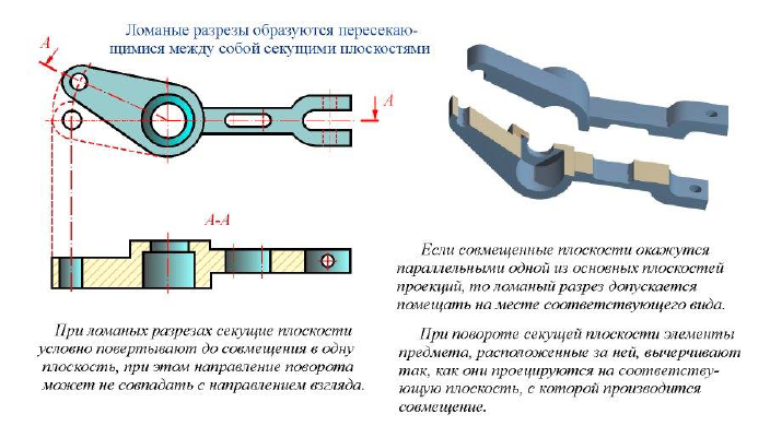 - При ломаных разрезах секущие плоскости условно повертывают до совмещения в одну плоскость, при этом направление поворота может не совпадать с направлением взгляда.