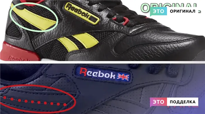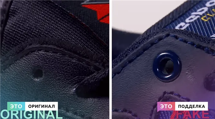 У оригинальной спортивной обуви Reebok существует обязательный декоративный элемент — это перфорация. Производитель ее наносит строго в две линии. В копиях чаще всего можно увидеть, что она полностью покрывает верх обувной поверхности.