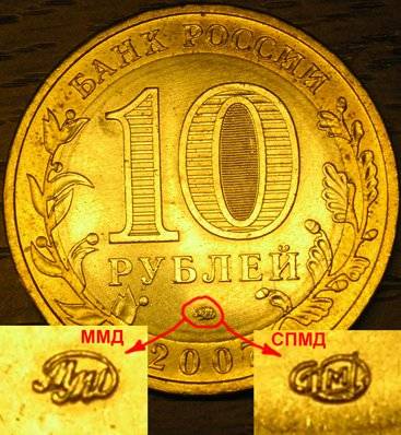 Но даже с лупой не всегда легко отыскать на монете эмблемы монетных дворов. Поэтому сразу подсказываем, что на 10 рублевых монетах знак монетного двора