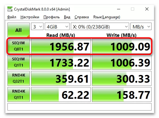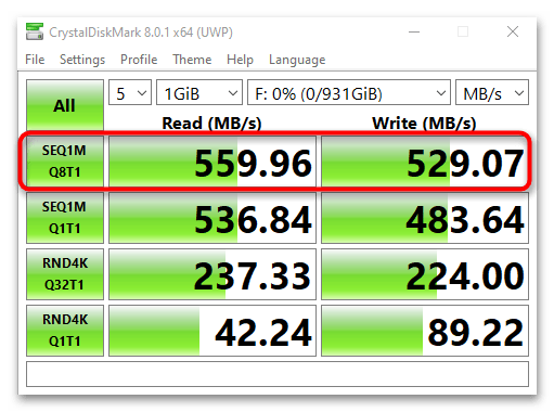 Сам по себе это очень старый интерфейс, появившийся в 2003 году. С тех пор он улучшился до ревизии 3 (III), и с 2008 года продолжается лишь ее доработка. В очень старых компьютерах еще можно встретить SATA II, но у подавляющего большинства материнских плат сейчас полная совместимость с SATA III. Разница между 2 и 3 поколением довольно большая, и самый значительный момент — пропускная способность. SATA II не раскрывает производительность SSD, поскольку ее пропускная способность до 300 Мбайт/с, в то время как у SATA III — до 600 Мбайт/с. На скриншоте ниже как раз виден пример того, с какими скоростями работает 2,5-дюймовый SSD (первая строчка), соответственно, SATA II ограничивал бы эти показатели примерно до 300.