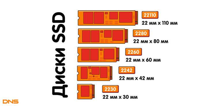 Достаточно важное различие — разница в размерах. На иллюстрации ниже вы можете увидеть разнообразие размеров M.2 SSD