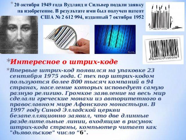 Идея автоматического считывания информации о товаре появилась в штате Филадельфия в США. Однажды к декану Технологического института при Дрексельском университете обратился президент сети магазинов с просьбой разработать компьютерную систему, которая распознавала бы продукцию на контроле.