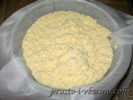 - После того как сыр приобретет характерную консистенцию, его нужно отбросить на марлю (сложенную в 2-3 слоя) и дать стечь сыворотке.