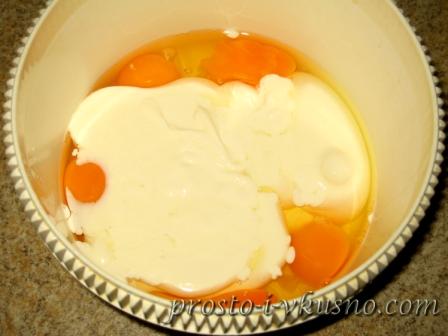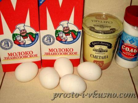 Отдельно при помощи миксера или блендера нужно взбить яйца со сметаной до однородной консистенции и влить её в молоко.