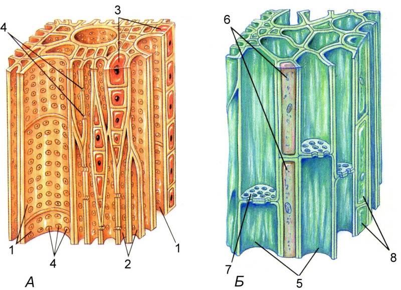Рисунок: Проводящие ткани. А – ксилема; Б – флоэма. 1 – сосуды ксилемы; 2 – трахеиды; 3 – клетки древесной паренхимы; 4 – поры; 5 – ситовидные трубки; 6 – клетки – спутницы; 7 – ситовидные поля; 8 – клетки лубяной паренхимы.