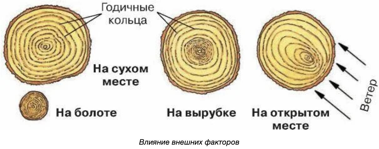 Годичные кольца древесины образуются в результате изменения сезонной активности клеток камбия. Внешний вид годичных колец обусловлен хронологической закономерностью: весной больше образуется проводящей ткани (более тонкая и рыхлая внутри), а осенью – механическая (толстая, более твердая). Именно поэтому годичные кольца на спиле дерева выглядят как чередование колец.