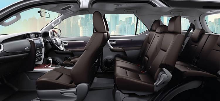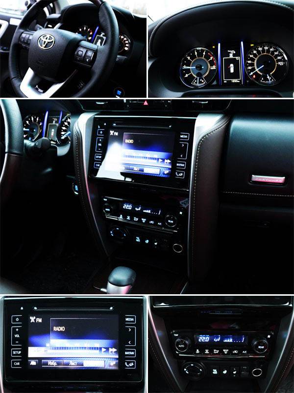 Салон Fortuner по-японски выдержан: сложная угловатая форма центральной консоли, практичная, аккуратная панель приборов, эргономичный руль, квадратные задние сиденья. Материалы отделки салона: кожа, металл, пластик и небольшие деревянные вставки.
