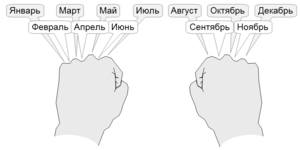 Счёт по костяшкам рук: «бугорок» — 31 день, «впадинка» — 30 дней (для февраля 29 или 28 дней)