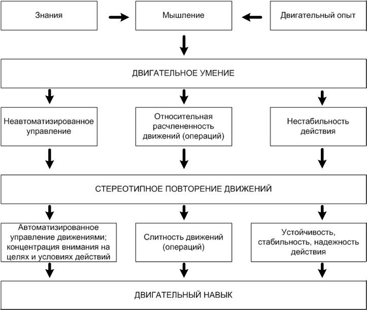 При овладении техникой какого-либо двигательного действия вначале возникает умение его выполнять, затем, по мере дальнейшего углубления и совершенствования, умение постепенно переходит в навык.