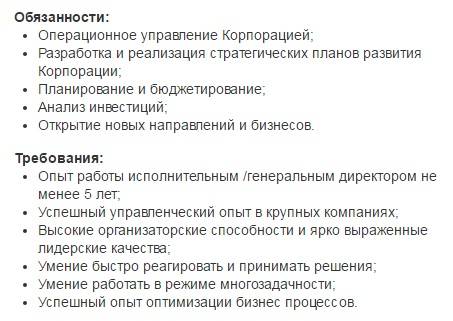 Пример вакансии на руководящую должность:
