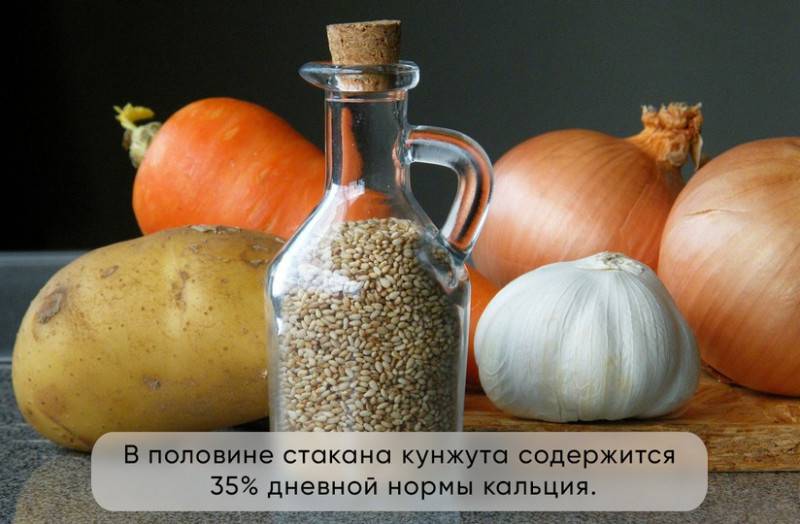 В 100 граммах кунжута содержится суточная норма кальция. А еще он богат медью, марганцем, цинком, селеном и другими важными для организма элементами. Это мощный источник «правильных» жирных кислот. Калорийность кунжута – 560 ккал на 100 грамм.