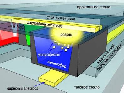 В какой-то степени принцип работы плазменной панели напоминает работу лампы дневного света, так как ячейки сами по себе испускают свет. Строение же такого экрана больше схоже с бутербродом, так как состоит из нескольких слоев. Если говорить простыми словами, то плазменный экран – это два стекла между которыми находятся полости, заполненные инертными газами, чаще всего это смесь ксенона с аргоном или неоном. С внутренней стороны стекол нанесены специальные вещества трех цветов – красного, зеленого и синего. Благодаря этим веществам строится конечное изображение. Строго напротив этих веществ расположенные специальные электроды.