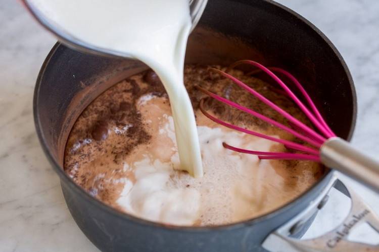 В небольшой миске необходимо смешать 2 ложки сливок и аррорут (кукурзный крахмал). Оставшиеся сливки вылить в сотейник и нагреть, добавить сахар и смесь с аррорутом и варить до загустения смеси. Шоколадную плитку растопить и быстро влить в массу. При подаче итальянцы украшают напиток апельсиновой цедрой.