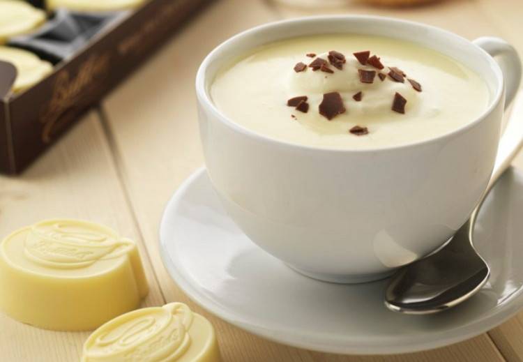 - Белый — придётся по вкусу любителям гастрономических экспериментов. Приготовить его можно в домашних условиях из 100-граммовой плитки белого шоколада, по желанию дополнив молочными продуктами и пряностями.