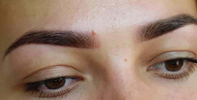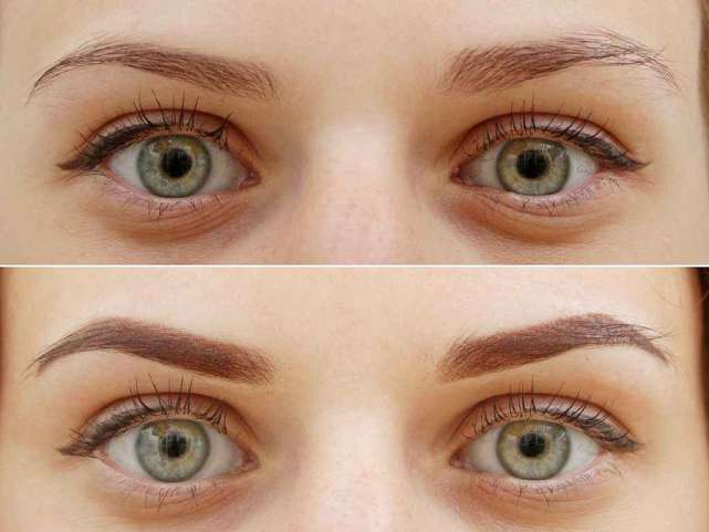 Контуры бровей аккуратно подчеркиваются, но остаются не такими четкими, как при глубоком внесении краски. На слишком редких бровях лучше все же делать микроблейдинг, иначе трудно достичь желаемых результатов, придется чаще корректировать форму бровей.