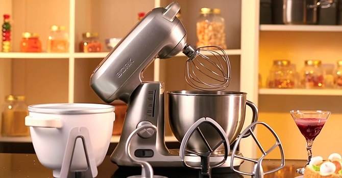 Основной комплект насадок содержит венчики, лопатки и крюк. Но его можно расширить и докупить насадку для мясорубки, терки, овощерезки, соковыжималки, приготовления лапши, равиоли. Прибор заменяет часть бытовой техники, экономит деньги и место на кухне.