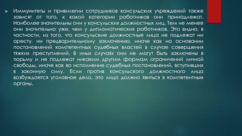 Слайд 10Иммунитеты и привилегии сотрудников консульских учреждений также зависят от того, к