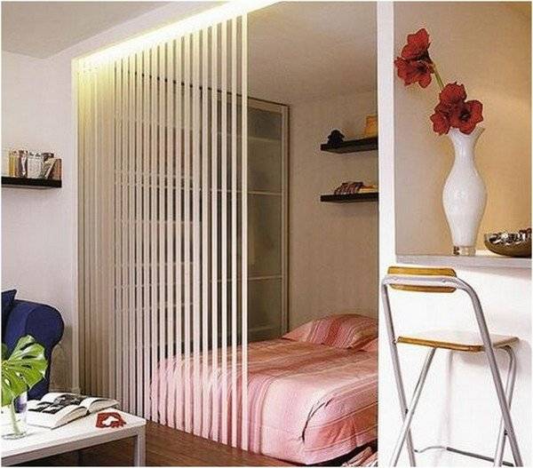 Помещение не обязательно делить на обеденную и спальную зону при помощи отделки стен, иногда достаточно декоративных ширм, полок или перегородок. Отличный прием для выделения кухонного пространства – барная стойка. Ее можно использовать по назначению или в качестве обеденного стола. Один из популярных приемов в дизайне интерьера – матовое стекло. Им можно облицевать дверцы шкафчиков или сделать перегородки для отделения спальни от обеденной зоны.