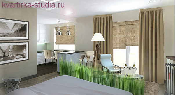 И так начнем с хороших вариантов. Одним из лучших вариантов считается планировка комнаты «вытянутой» вдоль стены с окнами, в таком помещение легче будет разместить зоны, и естественный свет будет освещать не только зону спальни, но и кухни тоже.