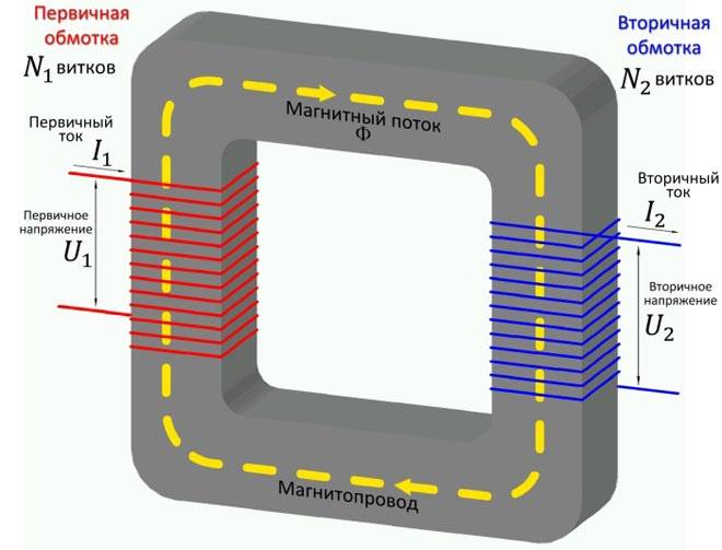 Действие трансформатора основано на законе электромагнитной индукции Фарадея. Когда по виткам первичной обмотки течет переменный ток, в пространстве внутри (в основном) обмотки действует переменное электромагнитное поле данного тока.