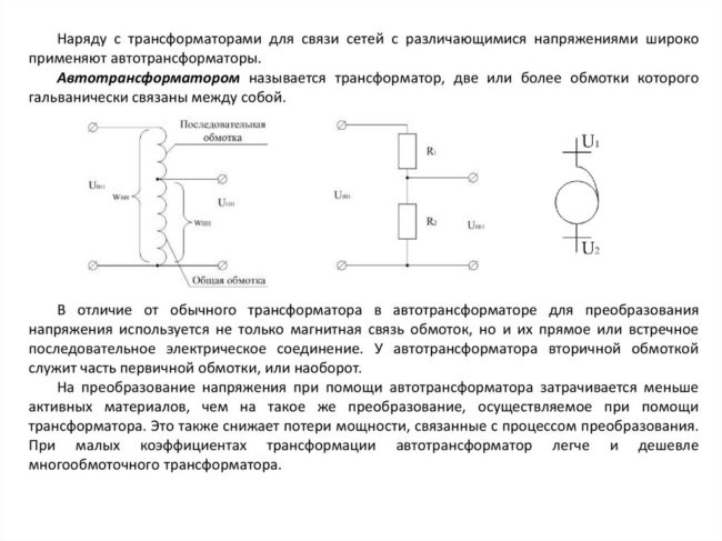 В автотрансформаторе часть витков первичной обмотки используется в качестве вторичной. Автотрансформаторы целесообразно использовать тогда, когда напряжение нужно понизить лишь немного, не в разы, как это делают обычные трансформаторы, а например в 0,7 раз.