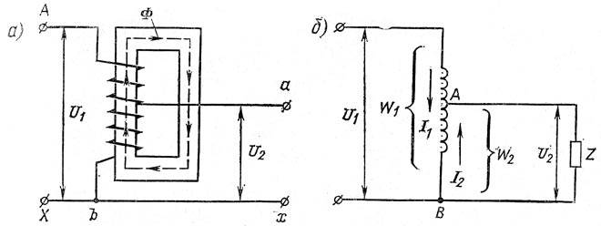 — однообмоточный трансформатор, называемый автотрансформатором. Он характеризуется тем, что между первичной (входной) и вторичной (выходной) обмотками существует магнитная и электрическая связь. Первичная и вторичная обмотки определяются отводами от общей обмотки.