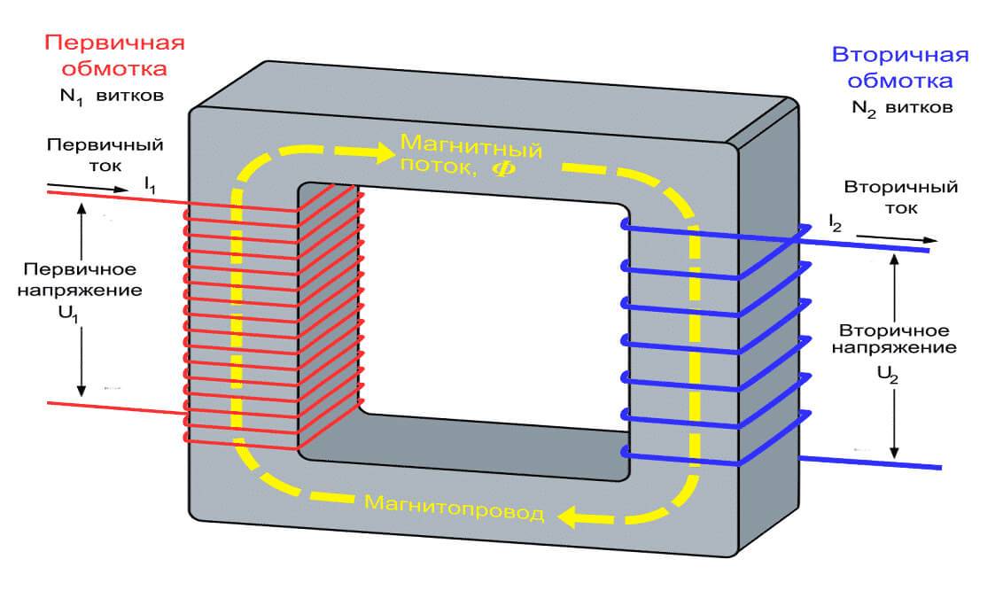 Действие трансформатора основано на законе электромагнитной индукции Фарадея. Когда по виткам первичной обмотки течет переменный ток, в пространстве внутри (в основном) обмотки действует переменное электромагнитное поле данного тока.