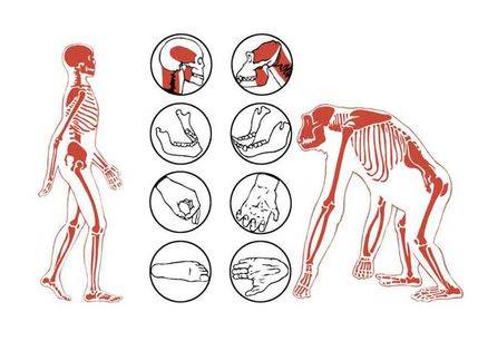 Большие отличия обезьян от человека обусловлены приспособлением первых к жизни на деревьях. Эта особенность, в свою очередь, ведет ко многим другим. Существенные отличия человека от животных, состоят в том, что человек приобрел качественно новые особенности — способность к прямохождению, освобождение рук и использование их как органов труда для изготовления орудий труда, членораздельную речь как способ общения, сознание, т. е. те свойства, которые тесно связаны с развитием человеческого общества.