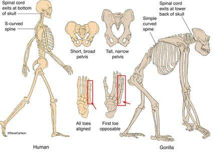 У обезьян позвоночник дугообразный, а у человека он имеет четыре изгиба, придающие ему S-образную форму. У человека более широкий таз, сводчатая стопа, смягчающая сотрясение внутренних органов при ходьбе, широкая грудная клетка, соотношение длины конечностей и развития отдельных их частей, особенности строения мышц и внутренних органов.