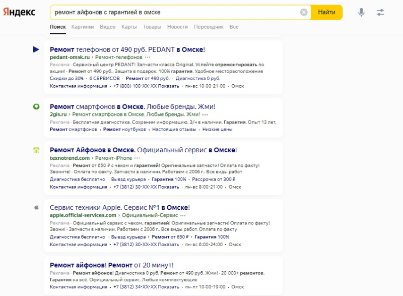 Контекстная поисковая реклама показывается над результатами поиска (часто – ещё и под ними) после того, как пользователь ввёл в строку поиска какие-то слова и нажал кнопку «Найти» («Поиск»). Ну, или ввёл запрос с помощью голосового помощника – в этом случае он автоматически преобразуется в текст, поэтому разницы между таким запросами практически нет. Рекламные объявления показываются в строгой связке с ключевыми словами: ситуация показа возникает, когда слова из настройки рекламной кампании совпадают со словами из поискового запроса пользователя. Таким образом, ситуация, при которой пользователь ищет, где заказать пиццу, а ему показывают объявление об отдыхе на турбазе – исключена.