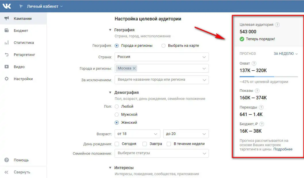 Настройки таргетированной рекламы в рекламном кабинете ВКонтакте будут такими: