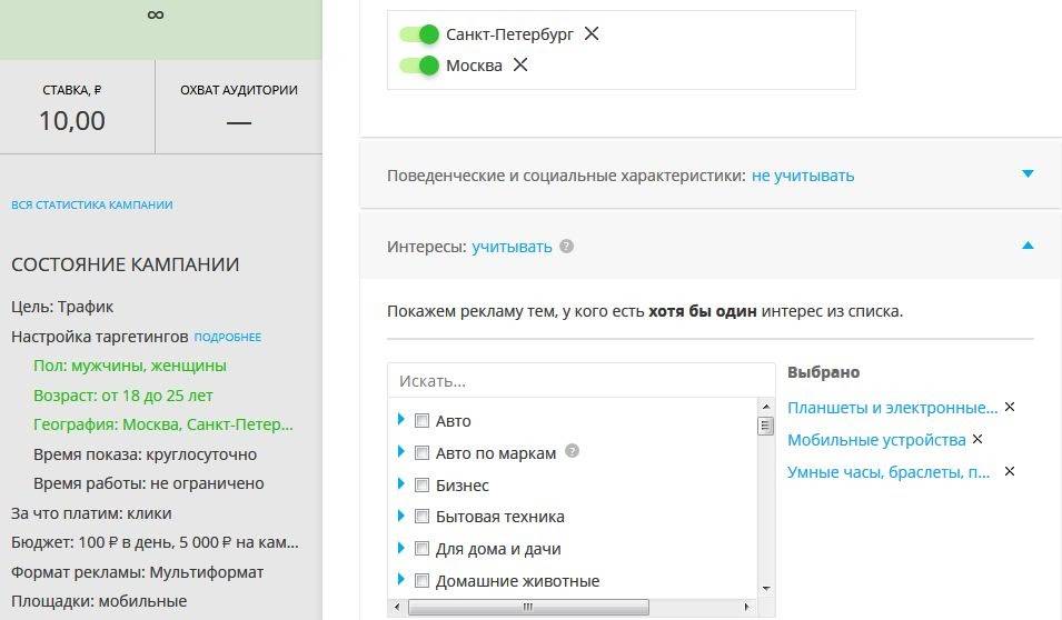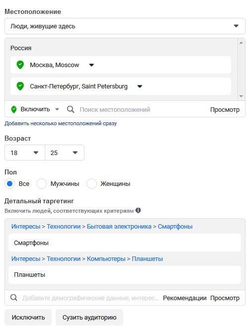 Приведем примеры настройки таргетированной рекламы в соцсетях для нового продукта – мобильного гаджета из примера выше. Настраиваем географию (Москва и Санкт-Петербург), возраст (от 18 до 25 лет) и интересы пользователей (Смартфоны и Планшеты).
