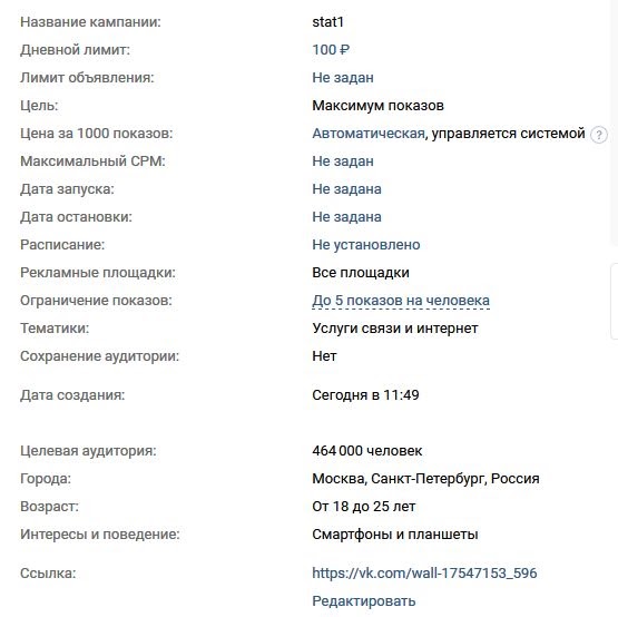 — настройки в рекламном кабинете.