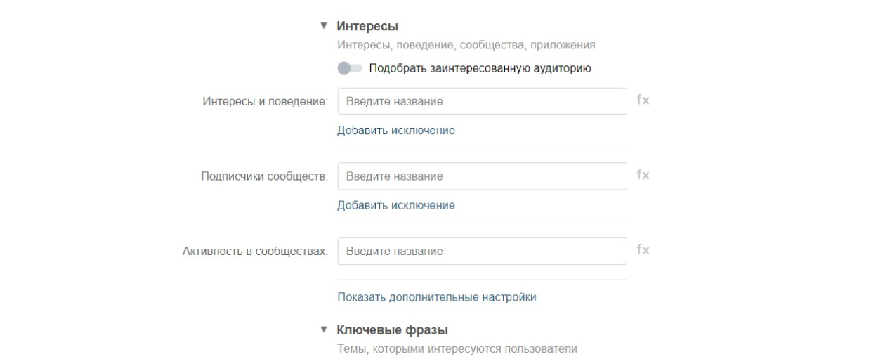 Таргет напротив работает с холодной аудиторией. Есть возможность настройки целого ряда параметров: