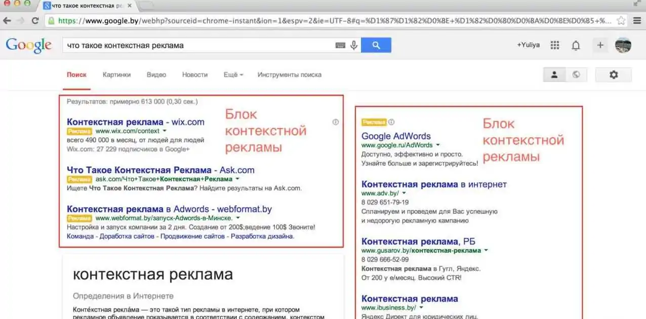 Контекстная реклама — это реклама в поисковых системах. Главными игроками здесь выступают Яндекс и Гугл. Рекламные блоки могут размещаться как в самих поисковых системах, так и на сайтах в виде баннеров.