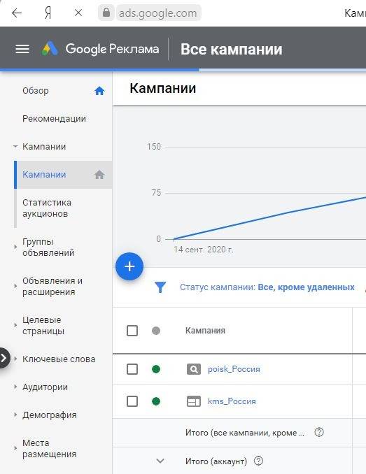 Для того чтобы создать новую рекламную кампанию в Google, нажимайте синюю круглую кнопку с плюсом: